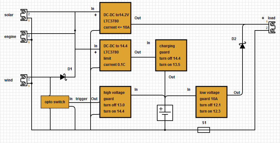I have battery pack 12V 27Ah (3 x 9Ah) and three electricity sources on my catamaran:
